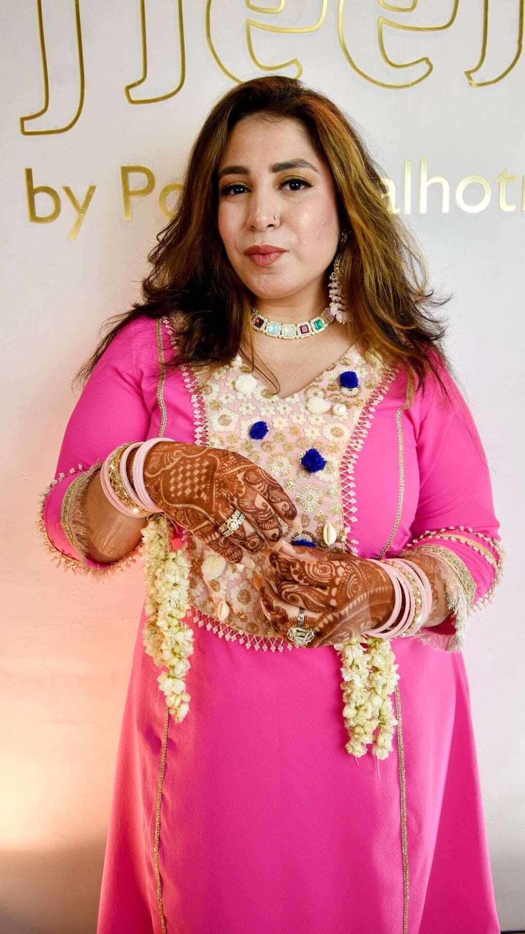 This hot pink outfit, featuring traditional golden gota and intricate shell handwork, is perfect for Karva Chauth and the festive season. The vibrant color and detailed craftsmanship make it a striking blend of tradition and modern elegance, ideal for celebrating in style.